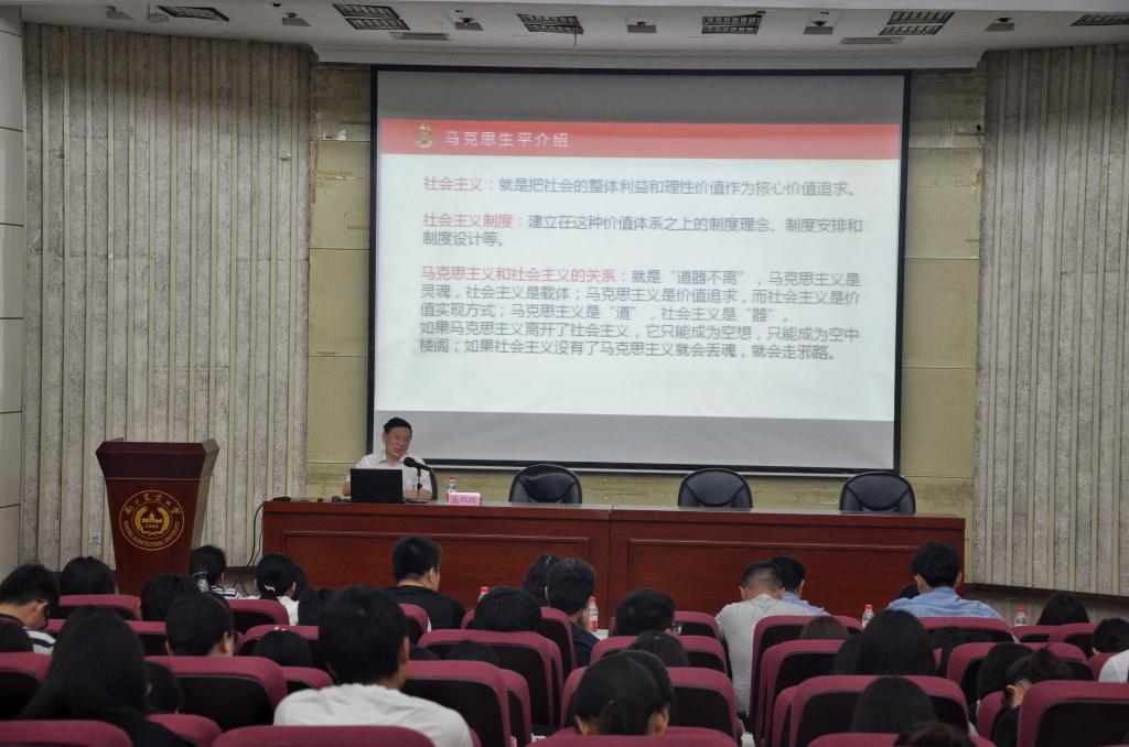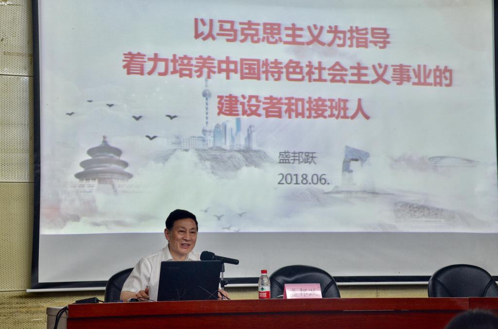 为深入学习习近平总书记在纪念马克思诞辰200周年大会上的重要讲话精神,持续将学习贯彻习近平新时代中国特色社会主义思想引向深入,6月6日下午,校党委副书记、纪委书记盛邦跃教授在图书馆报告厅给我校师生作了“以马克思主义为指导,着力培养中国特色社会主义事业的建设者和接班人”的专题讲座。太阳成集团tyc234cc主页党总支书记、院长余林媛、副院长姜萍、思政课教师代表、学院副书记代表以及人文学院大一学生参加了讲座。讲座由太阳成集团tyc234cc主页党总支副书记倪丹梅主持。