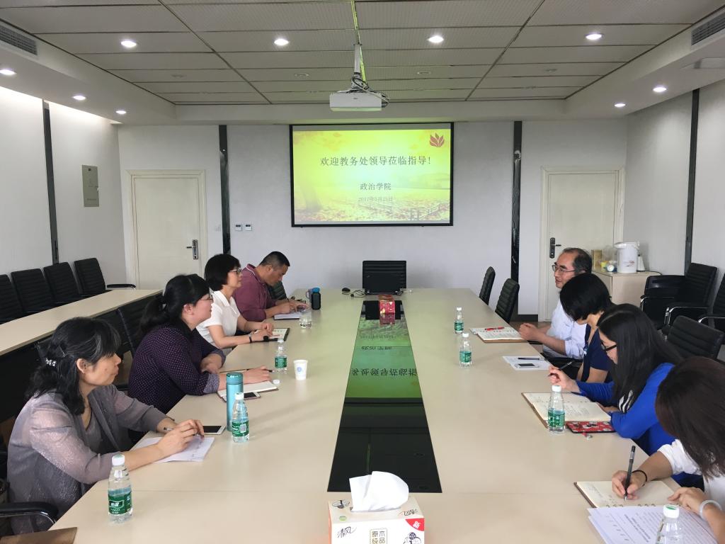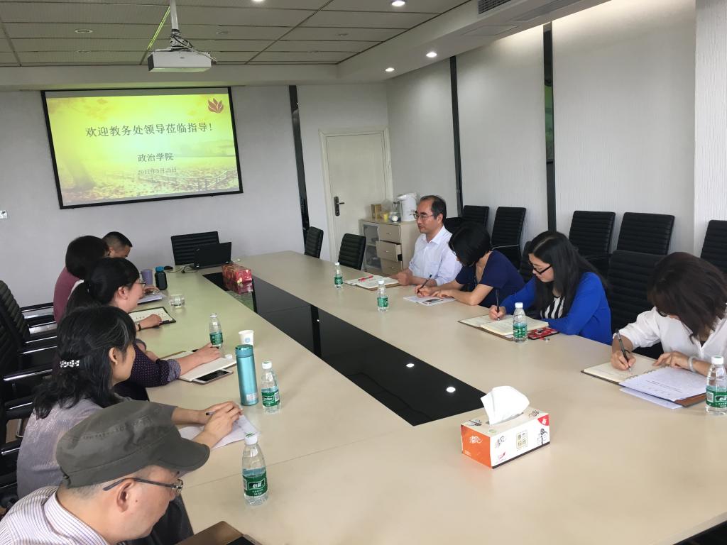 为更好贯彻落实教育部办公厅《关于开展2017年高校思想政治理论课教学质量年专项工作的通知》精神和我校《思想政治理论课教学质量年专项工作方案》,5月25日下午,校教务处副处长缪培仁一行四人到政治学院调研指导本科教学工作。政治学院院长、书记余林媛,副院长葛笑如,教研室主任和在职督导、教学秘书参加了调研工作会议。会议由余林媛主持。