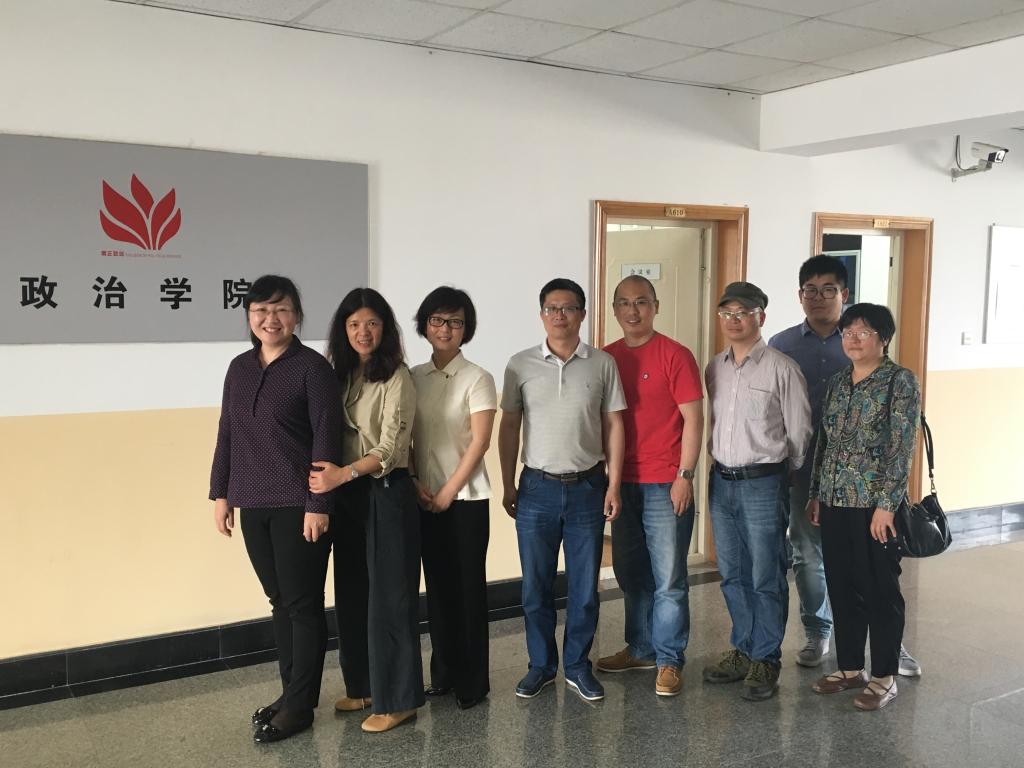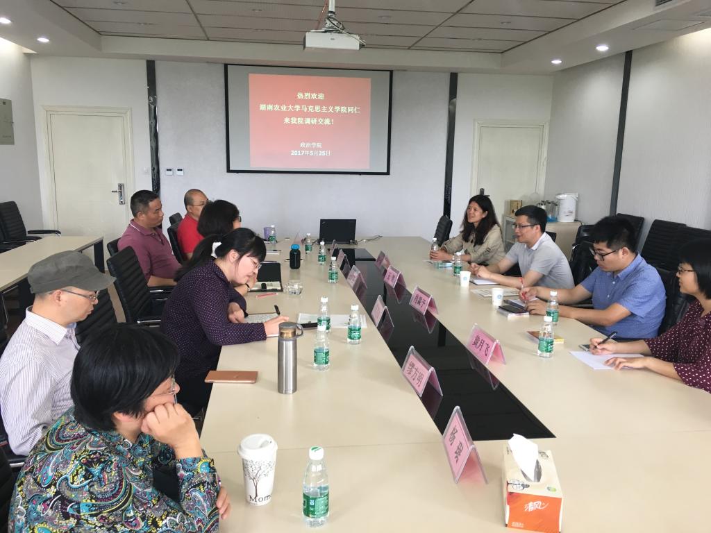 2017年5月25日,湖南农业大学太阳成集团tyc234cc主页副院长王健一行4人来我校政治学院考察交流,政治学院院长、书记余林媛、副院长葛笑如以及道德与法、概论教研室主任、教师代表一同出席座谈交流。